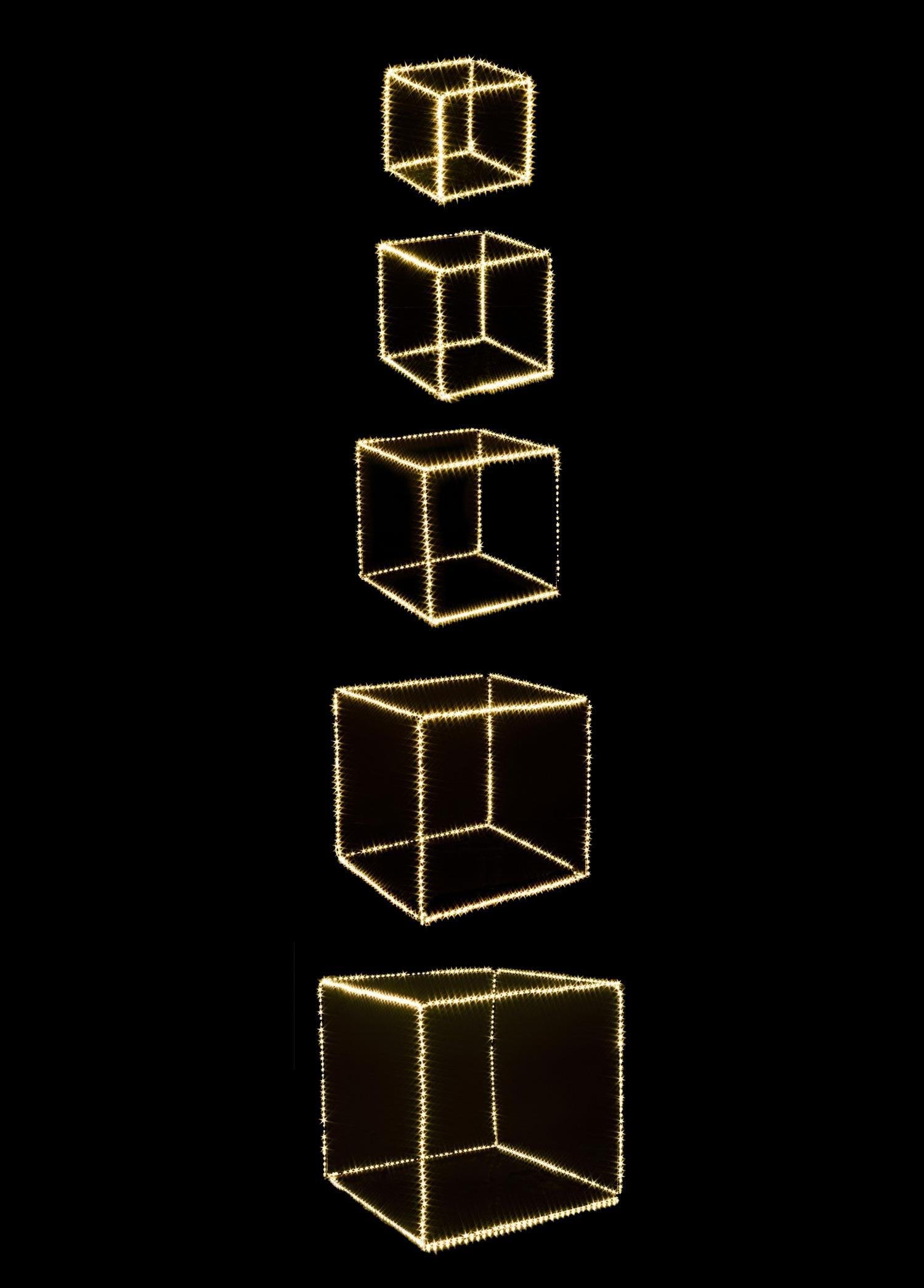 Led Aydınlatmalı Küp 5li Set. 1740 microled toplam 510microled, 410microled, 320microled, 270microled, 230microled. 5 trafo 12v-9w dahildir, her küp için bir ve 5 küpü birbirine bağlamak için 1 çoklu 12v-15w transformatör. Boyutlar: 55x55x55Ycm, 45x45x45Ycm, 35x35x35Ycm, 30x30x30Ycm, 25x25x25Ycm. Kablo uzunluğu 5m. Malzeme: Metal. Renk: Beyaz, Sarı ışık, ip20, İç mekan kullanımına uygundur.